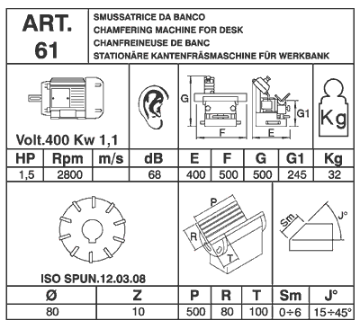 - Eine stabile, robuste Kantenfräsmaschine, zum Fräsen von Sicht- und Schweißkanten. Faseneinstellung mittels Handrad und Skala.Tisch gehärtet, mit Klemmung 500 mm lang. Axiale Verstellung des Frästisches zur ganzen Ausnutzung der ISO / DIN Wendeschneidplatten. Geeignet für alle Materialien, auch Kunststoff, durch Einsatz verschiedener Wendeschneidplatten.