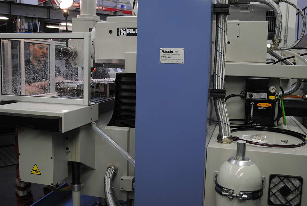 - Führungsbahnen: Die Gleitführungen sind gehärtet und geschliffen. Die Gegenführungen und die Stellleisten sind mit reibungsarmem Material beschichtet. Die Schmierung erfolgt automatisch im NC-gesteuerten Zyklus