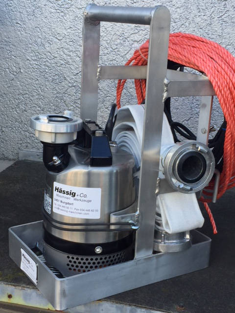 - Komplett mit 10 m Kabel, CEE-Motorschutzstecker, Storzkupplung und Halteseil