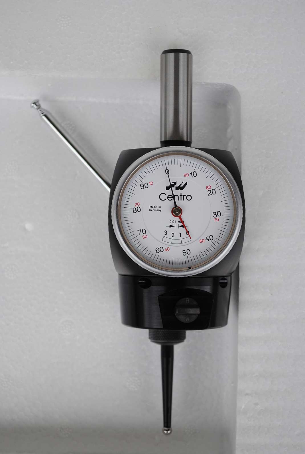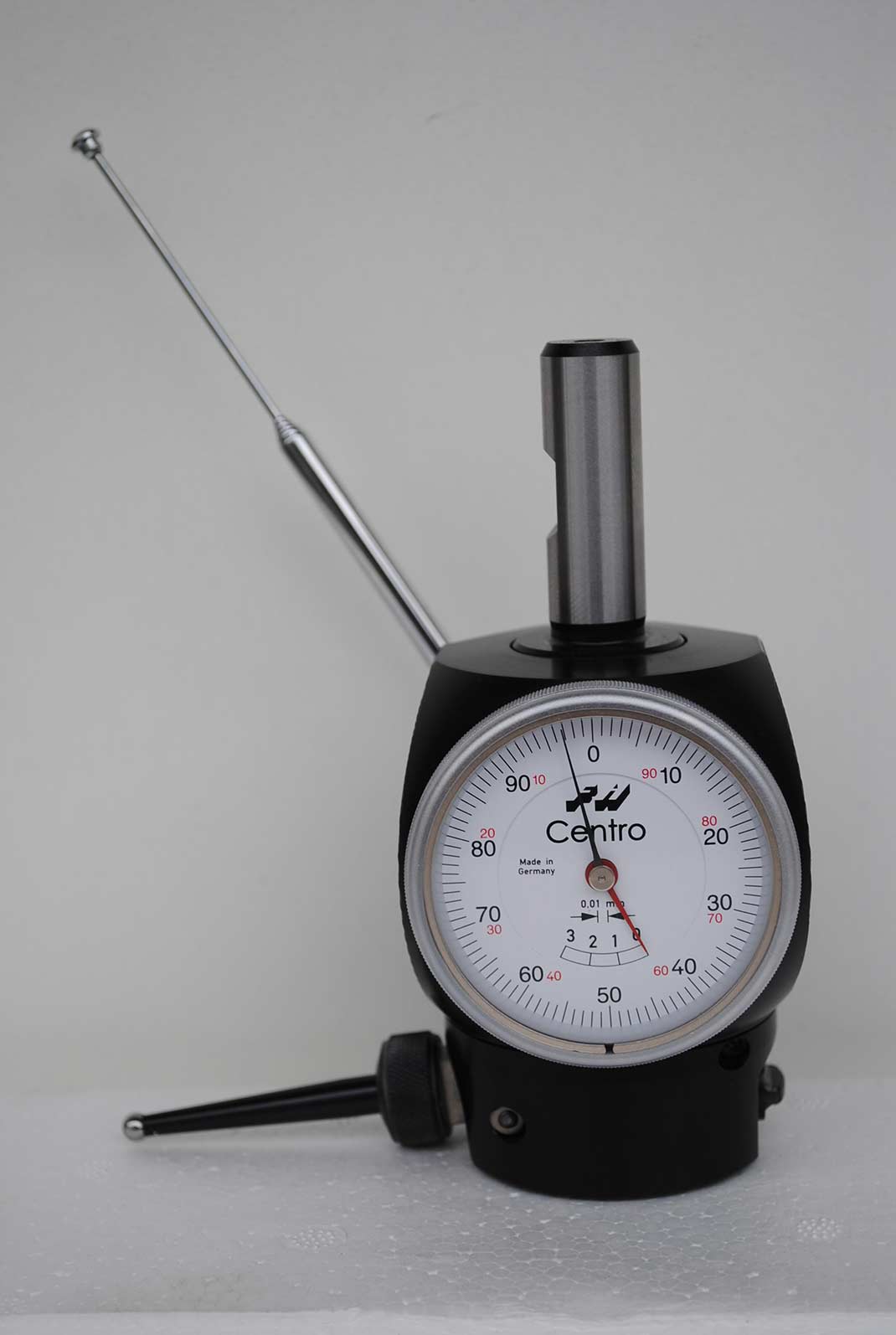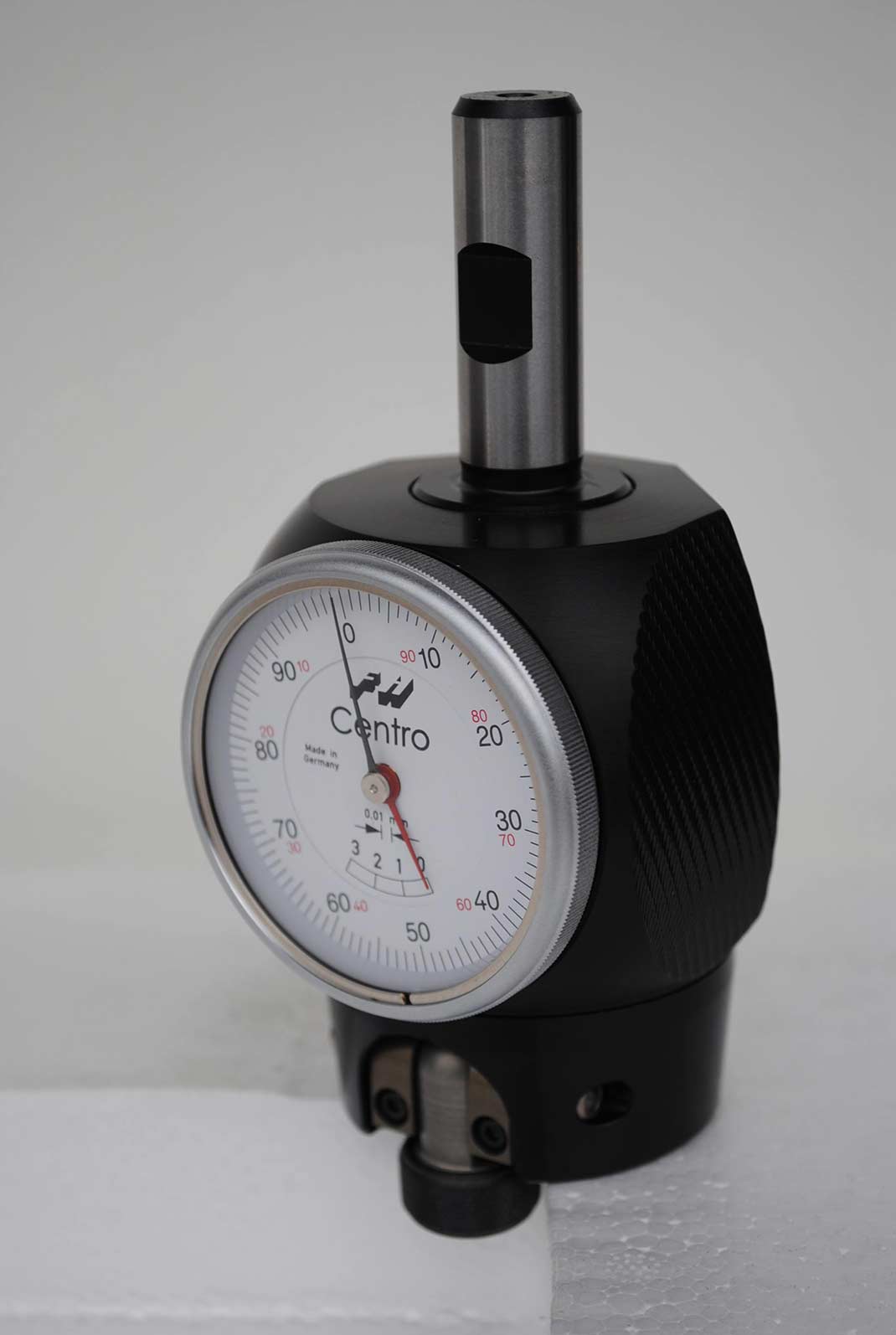 Mit Centro schnell und exakt Bohrungen und Wellen ausmitteln Der Centro wird in die Spindel der Fräsmaschine eingespannt und in die Nähe der gesuchten Achse gebracht. Der Tasteinsatz wird so eingestellt, dass die Tastkugel die Wand der Bohrung oder Welle berührt. ![]() Messuhr immer im Blick Der Tasteinsatz gleitet bei kleiner Spindeldrehzahl am Werkstück entlang und überträgt die Bewegung auf die Zeiger der Uhr. Das Gehäuse des Centro dreht sich nicht mit der Spindel und damit bleibt die Messuhr immer im Blickfeld des Bedieners. ![]() Centro findet die gesuchte Achse – sicher und zuverlässig Solange Spindel und gesuchte Achse nicht übereinstimmen, schlagen die Zeiger während der Drehung aus. Die Position der Spindel kann nun so lange korrigiert werden, bis die Zeiger der Messuhr still stehen. Jetzt ist die gesuchte Achse erreicht. | ||||||