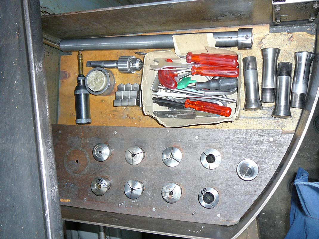 - Zubehör: Hebelschnellspannung, 12 Stk. Spannzangen W-25, Dreibackenfutter Ø130mm, Spindelstockspitze W-25, Stichelhaus, Reitstockbohrfutter MK-2, Reitstockspitze mitlaufend MK-2, Diverse Drehstähle, Bedienwerkzeug.